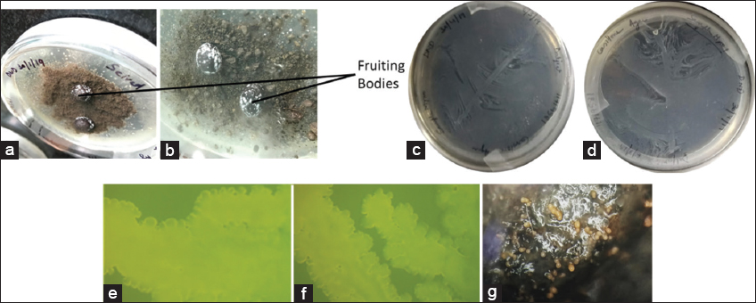 | Figure 1: Migration of myxobacteria on dung pellets (a and b); (c and d) showing swarm pattern of myxobacteria on Casitone agar plates; and microscopic view of swarming growth (e) MyxoMir001, (f) MyxoMir002 observed under Stereomicroscope at ×4, (g) fruiting bodies of MyxoMir001 on dung pellets. [Click here to view] |