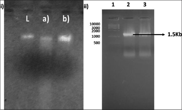 | Figure 2: (i) 0.8% agarose gel showing isolated genomic DNA of myxobacteria (L = Ladder, (a) DNA of MyxoMir001 and (b) DNA of MyxoMir 002; (ii) 1.2% agarose gel for the amplified DNA visualization; where well (1) 1 kb Ladder, (2) Amplified DNA of MyxoMir001, (3) Amplified DNA of MyxoMir002. [Click here to view] |