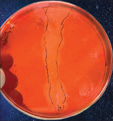 The primary screening of MyxoMir001 was done by observing the zone of hydrolysis through the Congo Red-NaCl staining procedure, which showed a positive result [Figure 4]. The secondary screening was done to affirm the enzyme localization through the 5-DNS method. On measuring the absorbance at 550 nm, the highest absorbance was recorded for the supernatant. This confirms the enzyme to be extra-cellular. Another study reported the utilization of the Congo-red staining and NaCl destaining procedures for the preliminary determination of cellulase production. In this study, isolated cellulase-producing strains from the Boniyar region of Kashmir were screened for cellulase production by this method [30].