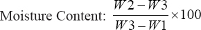 For the assessment of the moisture content of the soil, first, the container was cleaned, dried, and weighed to one decimal point, i.e., W1. Then, 50 g of soil was placed in the container and weighed to one decimal point, i.e., W2. After weighing, the container was placed in the oven at 110°C for 16 h. After drying, the container was transferred to a desiccator and allowed to cool down. After cooling, the container was weighed with the soil sample to one decimal point, i.e., W3. To calculate the moisture content, the following formula was used: