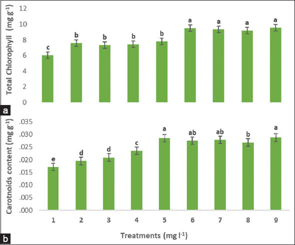 The application of the treatments showed a varying increase in the content of photosynthetic pigments. The combined treatments, especially those of AsA 100 + CaCl2 250 and AsA 100 + CaCl2 500, led to a significant increase in chlorophyll content [Figure 1]. Moreover, applying the combined treatments, the total chlorophyll was increased compared to the individual treatments. The highest total chlorophyll content was applied by treating AsA 100 + CaCl2 500. The combined treatment AsA 100 + CaCl2 500 and the individual treatment CaCl2 500 led to a significant increase in carotenoid pigment compared to the other treatments.