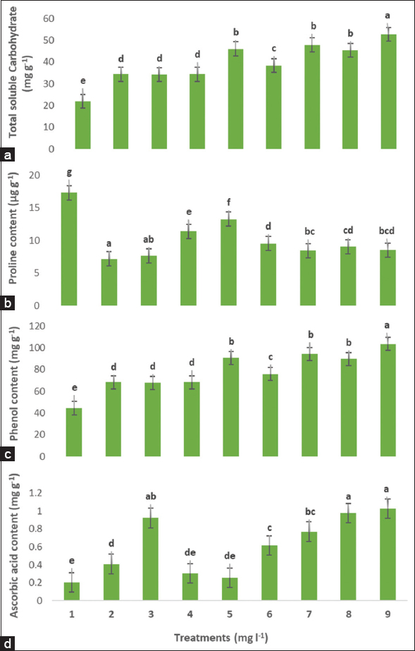 | Figure 2: Exogenous AsA and Cacl2 alone or combined on total soluble carbohydrate (a), proline content (b), phenol content (c), and ascorbic acid (d) content in Indian almond seedlings under high field temperature in July. Treatment numbers are described as (1) Control, (2) AsA 50, (3) AsA 100, (4) Cacl2 250, (5) Cacl2 500, (6) AsA 50 + Cacl2 250, (7) AsA 50 + Cacl2 500, (8) AsA 100 + Cacl2 250, (9) AsA 100 + Cacl2 500. According to the Duncan’s multiple range test, values within the same column show significant differences at P ≤ 0.05 significance level among treatments. Data are means of four replicates ± SD. [Click here to view] |