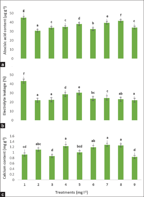 | Figure 3: Exogenous AsA and Cacl2 alone or combined on total abscisic acid content (a), electrolyte leakage (%) (b), and calcium content (c) in Indian almond seedlings under high field temperature in July. Treatment numbers are described as (1) Control, (2) AsA 50, (3) AsA 100, (4) Cacl2 250, (5) Cacl2 500, (6) AsA 50 + Cacl2 250, (7) AsA 50 + Cacl2 500, (8) AsA 100 + Cacl2 250, (9) AsA 100 + Cacl2 500. According to the Duncan’s multiple range test, values within the same column show significant differences at P ≤ 0.05 significance level among treatments. Data are means of four replicates ± SD. [Click here to view] |