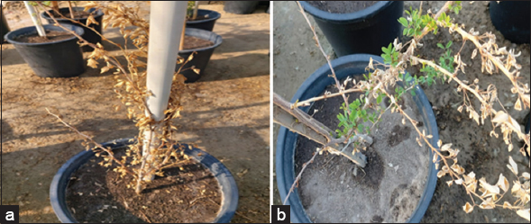 In this study, a tropical plant of Indian almond was grown in a subtropical environment. Subtropical regions suffer from high temperatures and little or no rain in the summer. Biochemical reactions within plants are sensitive to high-temperature stress, which vary with temperature, duration of exposure, and plant type [27]. High temperatures cause cell damage or plant death within minutes, and moderate temperatures may cause cell injury or death with prolonged exposure [28]. High temperature impairs plant growth stages and physiological processes and significantly reduces the productivity of many plant species [29]. High-temperature formats the harmful substances in plants due to disruption in the processes of photosynthesis and the ability to respiration in plants, subsequently, a change in the color of leaves to yellow, inhibiting growth processes in plants and destroying chlorophyll [30]. Water evaporates greatly from plants, causing them to dry out [Figure 1a]. Higher temperatures in the summer cause a decrease in growth parameters, photosynthetic pigments, and metabolic compounds, whereas proline and ABA increase [Figures 1-3]. The high temperatures increase the activity of the enzyme chlorophyllase, which destroys chlorophyll and increases the level of ABA, accelerating the decomposition of chlorophyll [30].