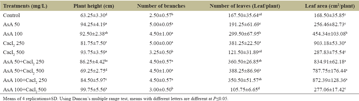 Table 1: Exogenous AsA and Cacl2 alone or combined on plant height, number of branches, number of leaves, and leaf area in Indian almond seedlings under high field temperature.