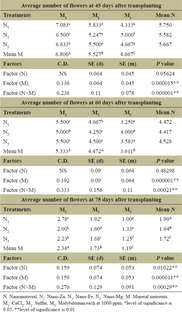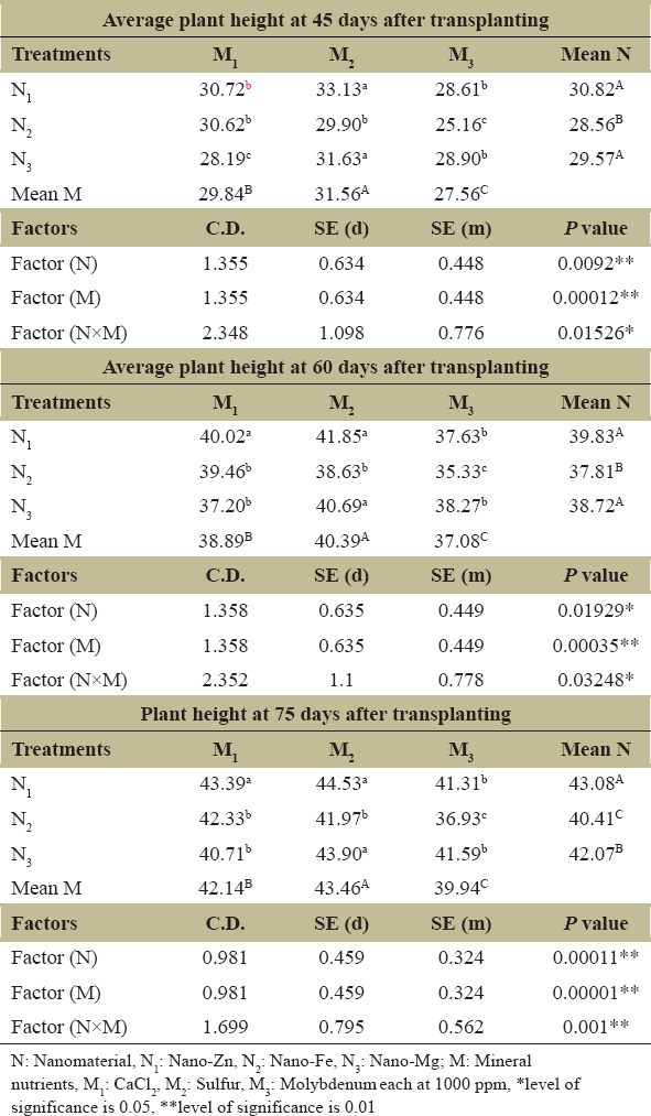 The application of S at 1000 ppm resulted in the highest plant height which was at par with the application of CaCl2 at 1000 ppm [Table 1]. Further, the significant interaction of these mineral nutrients with nanomaterials at 60 and 75 days after transplanting could be associated with the tolerance of plants against toxicity of heavy metals attributed to the enhanced biosynthesis of glutathione and phytochelatins in roots [15]. Although calcium does not have a direct role in the synthesis of biomolecules, it is essential for the integrity of cell walls so has given a significant response when combined with nano-Zn [16]. The present findings can be validated by the recommendations of [17], [18], Fazelian and Yousefzadi [19], [20].