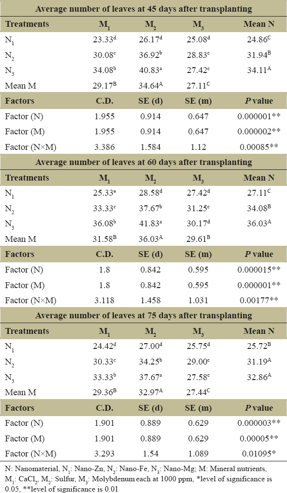 Further, the application of S at 1000 ppm has resulted in the highest number of leaves when applied in combination with nanomaterials as N3M2 (nano-Mg and S at 1000 ppm each) followed by N2M2 (nano-Fe and S at 1000 ppm each) [Table 2]. The interaction of nanomaterials with sulfur might have enhanced the synthesis of sulfur-containing aminoacids, resulting synthesis of protein which is essential for increasing the number of leaves [15]. The present experimental outcomes can be confirmed by the research outcomes of Haleema et al. [17], Schmidt et al. [25], and Shah et al. [26].