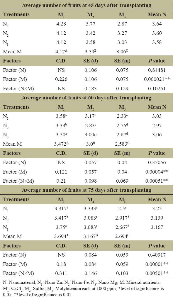 The number of flowers and fruits was counted on each plant of a replicated plot at 45, 60, and 75 days after transplanting and the average was estimated after dividing the counted value by the number of plants taken under observation.