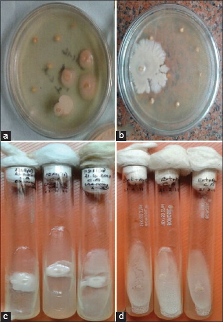 The endophytes were isolated from the seeds of C. annuum L. For the isolation process, the seeds were first washed under running tap water to remove any residue and then rinsed thoroughly with distilled water before surface sterilization. The seeds were then subjected to surface sterilization by dipping sequentially in 70% ethanol for 3 min and 0.5% sodium hypochlorite (NaOCl) for 1 min and were then transferred to a laminar airflow hood where they were rinsed thoroughly with sterile distilled water, and the excess water was dried out. The seed coat was removed, and the seeds were taken out with the help of a sterile needle and forceps and kept in sterile filter paper to dry again. A total of 150 seeds (50 seeds in each medium) were then inoculated on Petri plates using three different media, namely Potato Dextrose Agar (PDA), host extract + agar (HEA), and water agar (WA) [Figure 1e-g]. The plates were sealed with parafilm and incubated at 24±1°C for several days until the growth of the endophytes appeared on the plate [Figure 2a and b]. After incubation the endophytes growing out of the plated samples were removed with a fine, sterile needle and transferred to freshly prepared PDA and HEA slants, incubated for a few days and periodically checked for purity [Figure 2c and d]. The isolates were observed under the microscope for the typical moist appearance with smooth round colonies in the pure culture of yeasts, in contrast to the molds appearance of rough, dry colonies with aerial hyphae. The identified yeast isolates were again inoculated in a PDA medium from the slant by streaking method, and the pure yeast isolates obtained were then preserved at 4°C for further study.