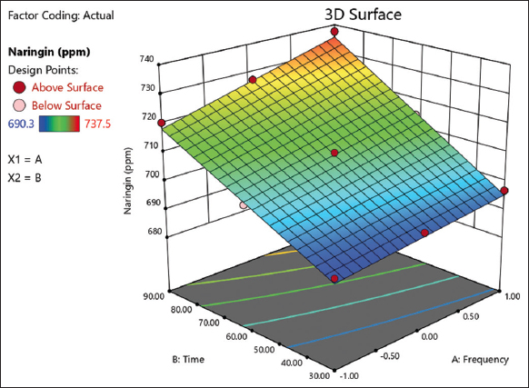 The naringin of sonication (non-thermal) processed juice varied from 690.30 to 737.50 ppm with an average value of 709.38 ppm [Table 2]. The maximum naringin content of grapefruit juice was found at the combination of frequency and time at 40 kHz and 90 min. Whereas the minimum naringin content of grapefruit juice was found at the combination of frequency and time at 20 kHz and 30 min. The value of predicted R2 (0.9240) is in acceptable agreement with the adjusted R2 squared of 0.9720 [Table 3]. The visual presentation for naringin content is given in the 3D surface plot [Figure 3] by comparing the effects of frequency and time by setting the reference point at the center point coded as 0 for both frequency and time in the design space. Nadeem et al. [23] stated the higher total phenolics and flavonoids in the ultrasound-treated carrot-grape juice blend than in the control carrot-grape juice blend. Results indicated that the increase in sonication time caused the increase in bioactive compounds of the carrot-grape juice blend. In a study, Ioannou et al. [24] reported the highest naringin content in the ultrasound-assisted extraction method. When an ultrasonic wave is generated, it propagates in the solvent and generates ultrasonic pressure waves. This creates a phenomenon known as acoustic cavitation, which produces bubbles. These break on contact with the cells, and they rupture the cell walls, allowing naringin to be released.