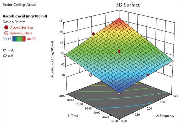 The ascorbic acid content of sonication (non-thermal)-processed grapefruit juice varied from 39.15 to 46.26 mg/100 mL with an average value of 42.26 mg/100 mL [Table 2]. The higher ascorbic acid content in grapefruit juice was found at the combination of frequency and time at 40 kHz and 90 min. Whereas the lower ascorbic acid content in grapefruit juice was found at the combination of frequency and time at 20 kHz and 30 min. The value of the predicted R2 (0.9432) is in fair agreement with the adjusted R2 of 0.9569 [Table 3]. The visual presentation for ascorbic acid content is given in the 3D surface plot [Figure 4] by comparing the effects of frequency and time by setting the reference point at the center point coded as 0 for both frequency and time in the design space. Nguyen and Nguyen [25] reported a significantly higher (P < 0.05) ascorbic acid content in the sonicated mulberry juice compared to the non-ultrasonic one. Nadeem et al. [26] observed the increased antioxidant activity of citrus juice samples after sonication. In a study on apple juice, Abid et al. [27] reported an increased ascorbic acid content in apple juice after sonication at 20°C. During the orange juice storage at 20°C, Knorr et al. [28] reported less ascorbic acid degradation in ultrasound-processed orange juice than in heat-treated orange juice. Further, the effective removal of oxygen in ultrasound treatment favored the comparatively less degradation of ascorbic acid in the orange juice. A similar study on ascorbic acid was also reported by Wang et al. [18] on mango juice and kiwi fruit juice sonication. Basumatary et al. [29] reported lower ascorbic acid levels in pomelo juice pasteurized at 90°C for 60 s in comparison to thermosonicated pomelo juice samples. Besides the thermal processing, further studies will be required on the non-thermal processing of grapefruit juice that can improve the nutritional and economic importance of grapefruit juice.