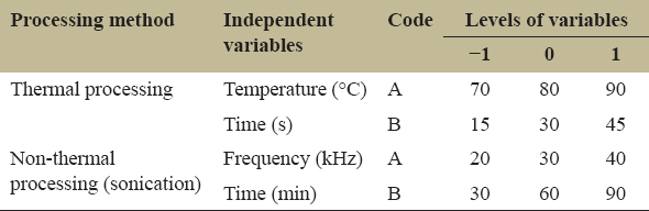 | Non-thermal processing (sonication) | Frequency (kHz) | A | 20 | 30 | 40 |