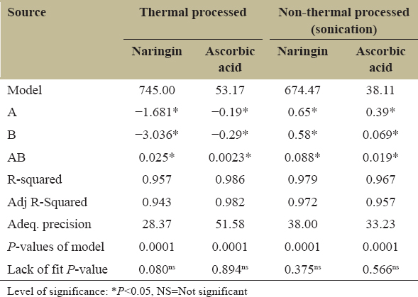 Variations in naringin and ascorbic acid content of thermal and non-thermal processed grapefruit juice were observed as dependent variables with respect to desired variable combinations of independent variables. The values of independent variables at three levels of factorial experimental design are presented in Table 1. There were 13 experiments in experimental design as presented in coded levels [Table 2]. For both thermal and non-thermal processed juice, a two-factor interaction model was fitted to assess the applicability of process variables on naringin and ascorbic acid content. To facilitate the visual presentation of responses with respect to variables, plots were obtained using the Design-Expert trial version (State-Ease, Minneapolis, MN).