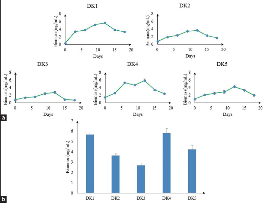 A growth curve analysis can determine the maximum growth time (days) for comparative tests and the amount of commercial development required for the highest possible biomass production. The calculation of biomass concentrations using OD at 750 nm as opposed to 680 nm was more accurate. Depending on the physiological stage of the organisms, photosynthetic pigments vary widely. A wavelength cutoff of 750 nm is used in microalgae cultures to prevent interferences with absorption caused by these pigments [15]. Inoculum development was carried out on BBM media. Algal isolates showed very fast and maximum growth on the 6th–12th days in the log period. All algal isolates attained the exponential phase on 12 days in BBM medium [Figure 2a]. Like cell division, it may be considered that the day 0–6 days is a preparatory phase where necessary cell organelles are synthesized for further multiplication onward. The maximum growth of algae isolates in BBM media showed on the 12th day. On day 12th, the maximum concentrated algal culture showed in DK1 (5.67 mg/mL), DK4 (5.84 mg/mL), and DK5 (4.24 mg/mL), but, in DK2 and DK3, it was 3.65 and 2.72 mg/mL, respectively, and it was lower than DK1, DK4, and DK5 [Figure 2b].