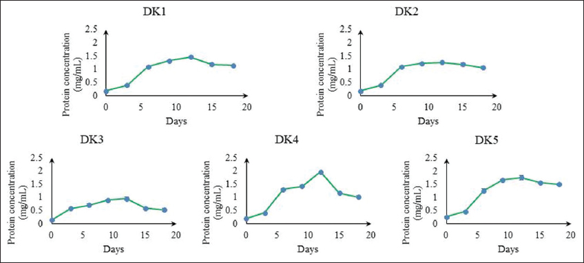 In BBM media, algal isolates showed maximum growth in the log period on the 6th–12th day. Spontaneously, five algal isolates attained the maximum protein concentration on 12 days in BBM medium [Figure 3]. Out of five algal isolates, DK1, DK4, and DK5 algal isolates were the best isolates in terms of protein yield on 12th-day biomass estimation. It was 2.057 mg/mL, 1.955 mg/mL, and 1.761 mg/mL of dry biomass, respectively, and low protein yield in DK2 and DK3 isolates and it was1.26 mg/mL and 0.936 mg/mL of dry biomass, respectively [Figure 4a]. If we expressed the protein content in μg/mg, the amount of protein content would be 362.52, 343.41, 345.11, 334.98, and 415.08 μg/mg of dry biomass of the five algal isolates, namely, DK1, DK2, DK3, DK4, and DK5, respectively, on the day 12th [Figure 4b]. This data (μg/mg) concludes that DK2 and DK4 had lower protein content in their dry biomass. DK2 isolates were not considered for further study after the slow growth rate. Only DK1, DK4, and DK5 were considered for further comparative analysis. Moreover, experimental results show that DK1 algal isolate (per dry biomass) contains 36(±2) % total protein content which is promising and comparable with existing algal regimes [Table 1]. However, DK1 algal isolate might accumulate an even higher quantity of total protein content per unit biomass if multi-process parameter optimization, stress responsive studies, and metabolic engineering can be done in the near future as a follow-up study toward large-scale production [32,33].