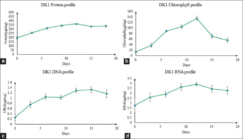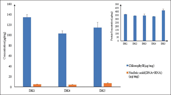 On the day 12th, the total amount of DNA was quantified, and it was 1.29, 1.3, and 1.77 μg/mg of dry biomass of DK1, DK4, and DK5 algal isolates, respectively. However, the total amount of RNA of DK1, DK4, and DK5 isolates were 3.92, 3.26, and 5.54 μg/mg, respectively. DK1 and DK4algal isolates had less amount of nucleic acids (DNA+RNA), and it was 5.21 and 4.56 μg/mg of dry biomass on the day 12th of culture. However, in the DK5 isolate, the residual amount of nucleic acid was 7.31 μg/mg on the same day of biomass estimation which was higher than both DK1 and DK4 algal isolates [Figure 5]. On the contrary, DK1 isolates also had a high amount of protein, and chlorophyll and the residual amount of nucleic acid were low. In comparative Table 1, it had clearly been shown that DK1 algal isolate bears comparatively lower total nucleic acid percentage per unit dry algal biomass weight, that is, 0.52(±0.13)%. It was also a good sign as a food supplement with minimal side effects on human health [34].