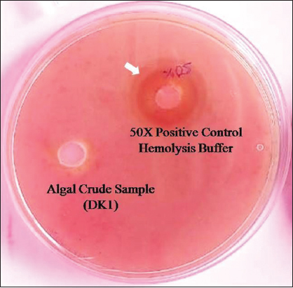 DK1 algal isolates’ crude culture did not show any zone in the agar plate. However, 50X buffer showed a clear zone on the sheep blood agar plate. This result showed that the DK1 algal isolates had no pathogenic activity compared to the blood cell lysis buffer [Figure 6]. This positive control lysis buffer broke down the red blood cell by disrupting the cell membrane. The non-pathogenic gesture of DK1 isolate could establish it as an enormously acceptable cheaper SCP supplement for under-nourished communities and large-scale production in food industries [22].