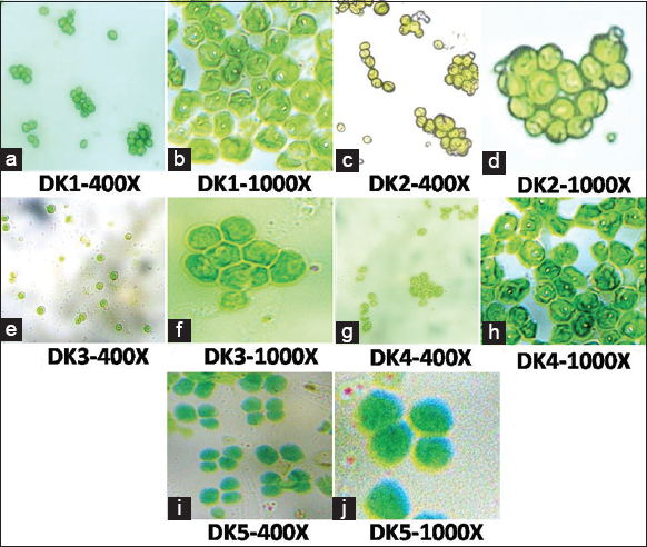 | Figure 7: Microphotographs of all the microalgae involved in this study. (a and b) Mohanpur (DK1) ×400, ×1000; (c and d) Temohoni (DK2) ×400, ×1000; (e and f) Daspur (DK3) ×400, ×1000; (g and h) Binpur (DK4) ×400, ×1000; (i and j) Dherua (DK5) ×400, ×1000 magnification. [Click here to view] |