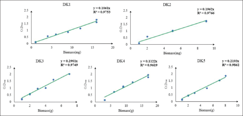 | Supplementary Figure 1: Calibration curve of collected algal isolates in (mg/mL) on dry biomass. [Click here to view] |