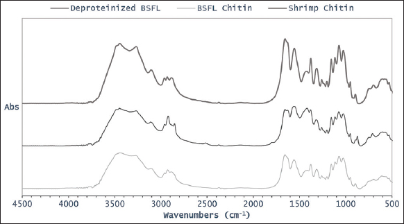 Table 2: Fourier-transformation infrared peaks of deproteinized BSFL, chitin derived from BSFL, and commercial chitin derived from shrimp.