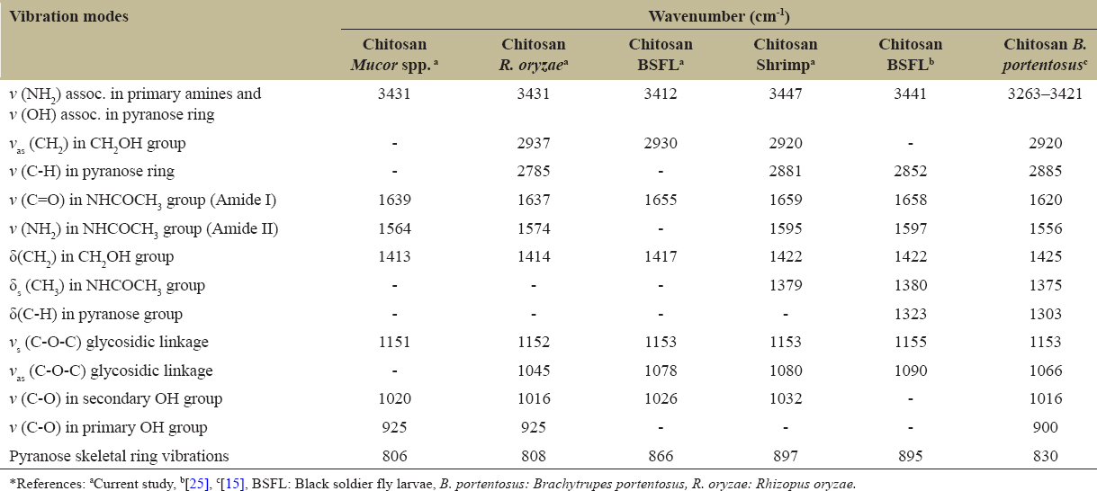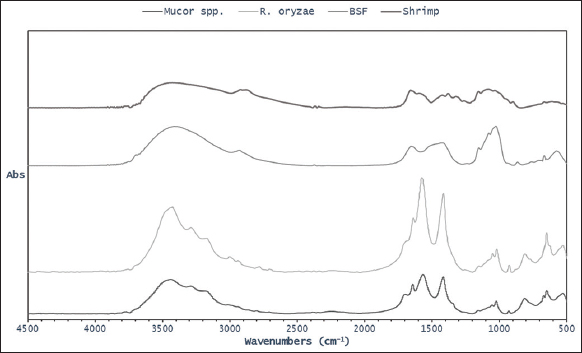 | Figure 3: Fourier-transformation infrared spectra of chitosan derived from Mucor spp., Rhizopus oryzae, and black soldier fly larvae and commercial shrimp. [Click here to view] |
