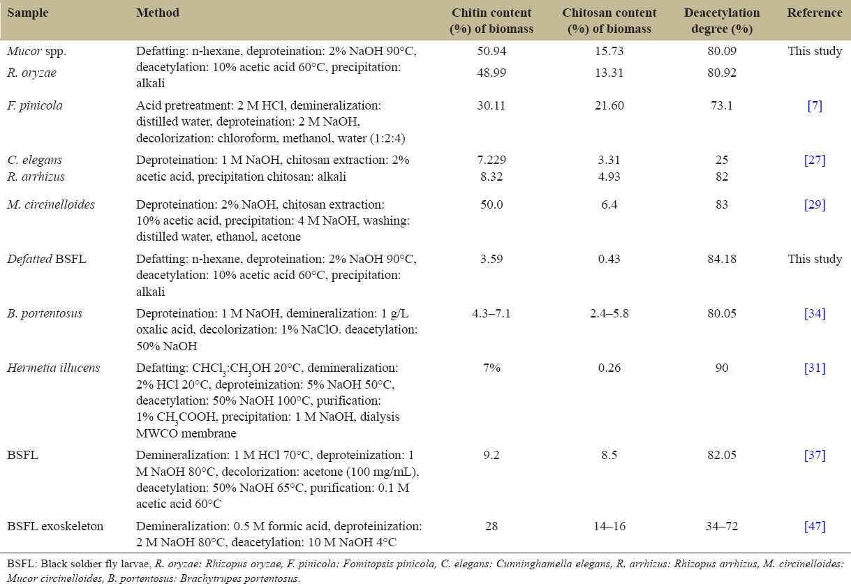 The recovery of chitosan from selected fungi and insects is presented in Table 1 and the schematic diagram of chitin and chitosan production from Mucor spp. R. oryzae, and BSFL is shown in Figure 1. Chitosan from Mucor spp. biomass has the highest recovery (157.3 mg/g biomass) while chitosan from defatted BSFL has the lowest recovery (4.282 mg/g biomass). The reason behind the high chitosan recovery in fungi, especially Mucoraceae family may be due to the relatively high chitin content that can contribute up to 50% w of its total biomass composition [27]. In addition, chitosan from R. oryzae also shows a promising result which yielded up to 133.1 mg/g biomass. Chitosan in fungal cells are not only bound to glucan in membrane materials but also as free chitosan [28] During exponential growth phase, the amount of free chitosan molecules is relatively high due to active formation of the building blocks of cells [29]. Therefore, the formation of more cell walls results to the higher amount of chitin and chitosan. When the yield of biomass and chitosan is compared, the yield of R. oryzae biomass (1.307 g/100 mL) is higher than the Mucor spp. (0.554 g/100 mL), but the chitosan yield is the opposite. Extractable chitin and chitosan yield depends on species, culture condition, age or cultivation time, and extraction method [29, 30].