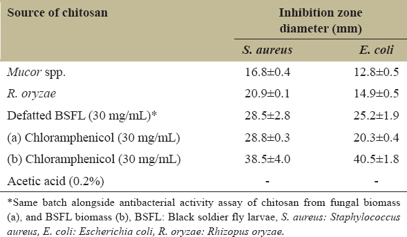 Table 4: Inhibition zone diameter of chitosan derived from fungal and BSFL biomass.