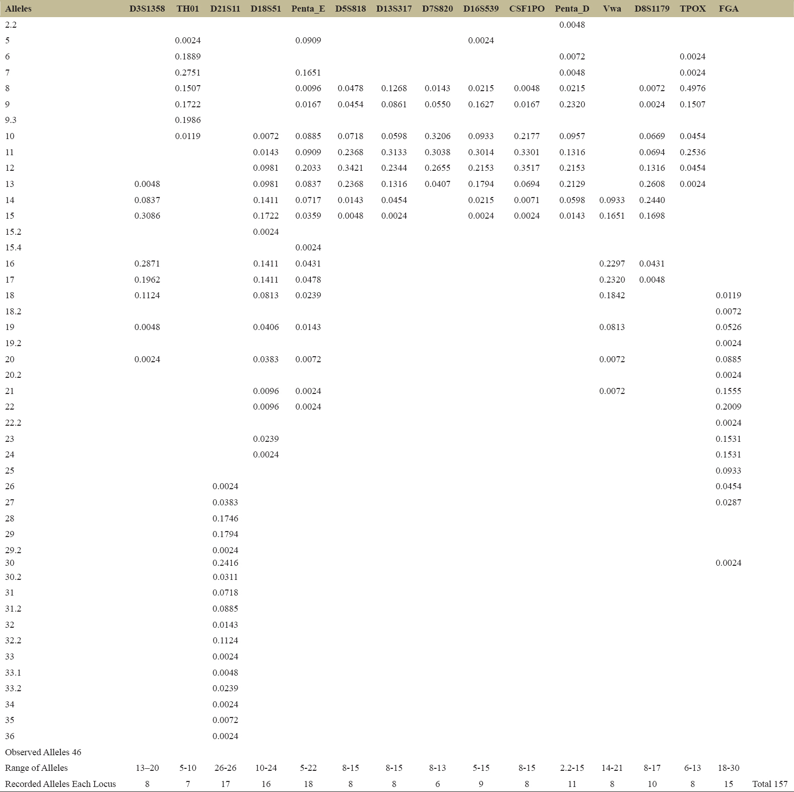| Recorded Alleles Each Locus | 8 | 7 | 17 | 16 | 18 | 8 | 8 | 6 | 9 | 8 | 11 | 8 | 10 | 8 | 15 | Total 157 |