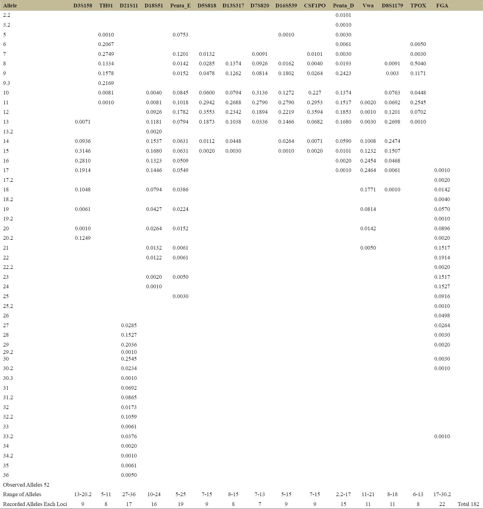 Forensic and population genetics metrics such as allele frequency, matching probability, polymorphism information content, expected and observed heterozygosity and homozygosity, power of exclusion, discriminatory capacity, and paternity index were determined using FORSTAT (Forensic Statistic Analysis Toolbox) FORSTAT web tool which implements the common GENEPOP format to evaluate forensic genetics statistics. The simplicity and ease-of-use are achieved by automation of data entry and calculations which reduce analysis time and labor inputs [13]. In FORSTAT, the analyzed sample profiles were entered into and required data such as frequency and forensic parameters automatically analyzed by the software and results obtained.