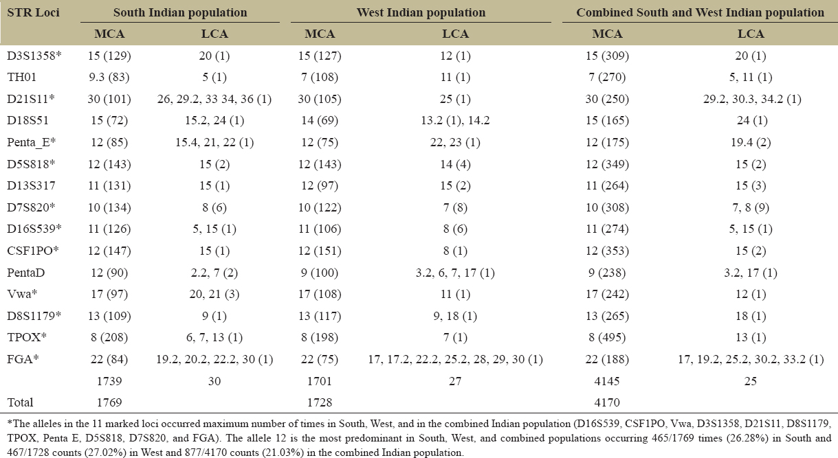 * The alleles in the 11 marked loci occurred maximum number of times in South, West, and in the combined Indian population (D16S539, CSF1PO, Vwa, D3S1358, D21S11, D8S1179, TPOX, Penta E, D5S818, D7S820, and FGA). The allele 12 is the most predominant in South, West, and combined populations occurring 465/1769 times (26.28%) in South and 467/1728 counts (27.02%) in West and 877/4170 counts (21.03%) in the combined Indian population.
