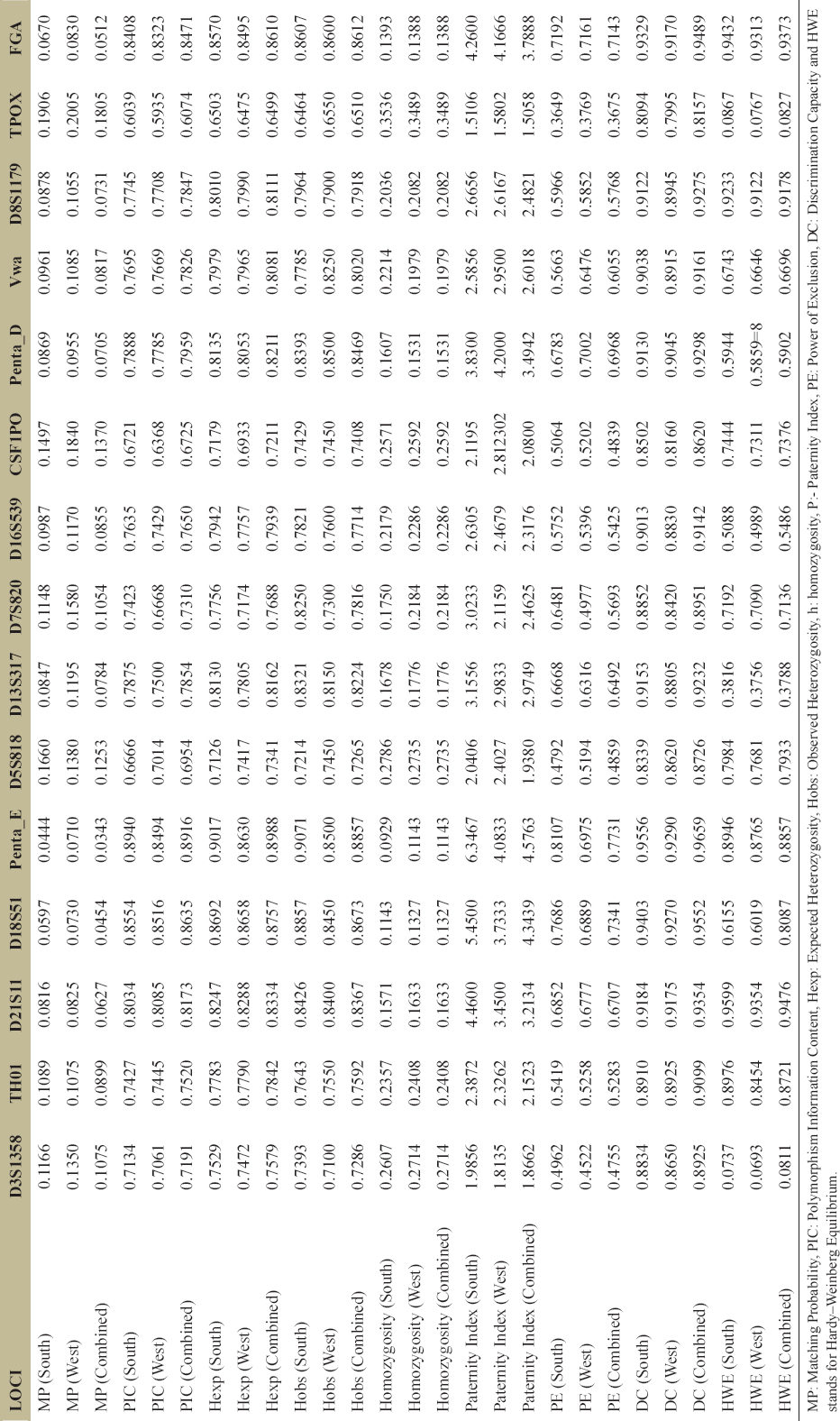 In the South, West, and combined Indian populations, the lowest expected heterozygosity (Hexp) values were 0.6503, 0.6475, and 0.6499, respectively, at the locus TPOX, and the maximum values of 0.9017 and 0.8988 at locus Penta E were recorded in South and combined Indian populations and 0.8658 in the locus D18S51 in the West Indian population. The minimum observed heterozygosity (Hobs) values were 0.6464, 0.6550, and 0.6510 in the South, West, and combined Indian populations, respectively; whereas the corresponding maximum observed heterozygosity values were 0.9071 and 0.8857 in the South and combined Indian populations and 0.8600 at FGA locus in the west. The minimum homozygosity values of 0.0929 and 0.1143 were found at locus Penta E in the South and combined Indian populations, respectively, while 0.1400 was found at locus FGA in the west. Among the South, West, and combined Indian populations, the highest homozygosity values were 0.3536, 0.3450, and 0.3489, respectively at the locus TPOX. The Power of Exclusion (PE) minimum values of 0.3649, 0.3769, and 0.3675 were recorded at locus TPOX in the South, West, and combined Indian populations, respectively, whereas the corresponding maximum values of 0.8107 and 0.7731 were noted at Penta E in the south and combined Indian populations, respectively, and in the west, it was 0.7161 at FGA locus. The paternity index (PI) minimum values of 1.5106, 1.5802, and 1.5058 were observed at locus TPOX in South, West, and combined Indian populations, respectively, while the maximum values of 6.3467 and 4.5763 were observed in Penta E in the South and combined Indian populations, respectively, while in the west, it was 4.2000 in Penta D locus. In both populations, no divergence from Hardy–Weinberg equilibrium was detected (P > 0.05).