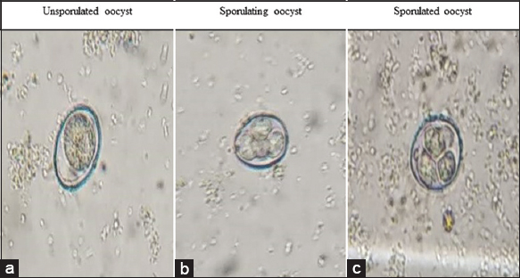 | Figure 1: (a-c) Differentiation of sporulation of Eimeria oocysts visualized under a microscope at ×40. Images were captured during sporulation analysis. [Click here to view] |