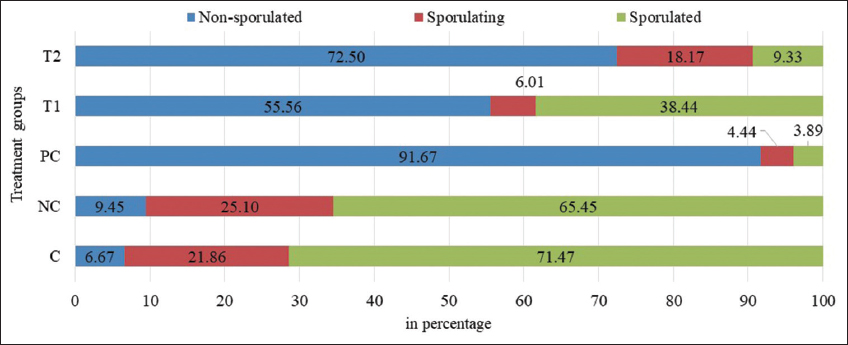 The groups were evaluated for IA and the results are shown in Table 2. IA results give the overall view on the efficiency of the reagent or product that was tested in this study, as it considers the sporulating cells tending to become a sporulated stage. It was observed that the highest IA of 91.30% was observed for PC followed by T2 (70.58%), T1 (52.25%), and NC (2.96%), and was found to be statistically different between each of the groups (P < 0.05).