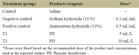 * Doses were fixed based on the recommended dose of the product and concentrations used in the reported studies. PD: Phenolic disinfectant