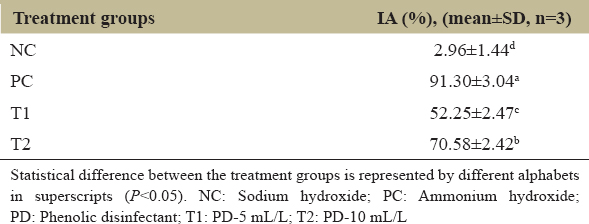 Statistical difference between the treatment groups is represented by different alphabets in superscripts (P<0.05). NC: Sodium hydroxide; PC: Ammonium hydroxide; PD: Phenolic disinfectant; T1: PD-5 mL/L; T2: PD-10 mL/L