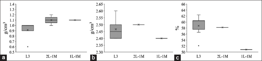 Figure 2b reports that the average soil densities in the soil in the 3L, 2L-1M, and 1L-1M areas were 2.47 ± 0.08 g/cm3, 2.5 ± 0 g/cm3, and 2.40 ± 0 g/cm3, respectively. The results are consistent with the average topsoil values of the main soil types in Vietnam, ranging from 2.49 to 2.83 g/cm3 [4]. Soil densities <2.5 g/cm3 are associated with high humus content, which is suitable and favorable for rice cultivation [26]. However, particularly in the 3L soil, a 2.6 g/cm3 density was observed. All soil types had a porosity value above 50% [Figure 2c], considered ideal for plant growth [27]. According to Khoa and Ti [26], high soil porosity is for plants to grow and vice versa. On the other hand, poorly aerated soil can limit roots’ growth, mainly affecting nutrient absorption. The results show that density and porosity values in the study area are within the appropriate thresholds for good plant growth.