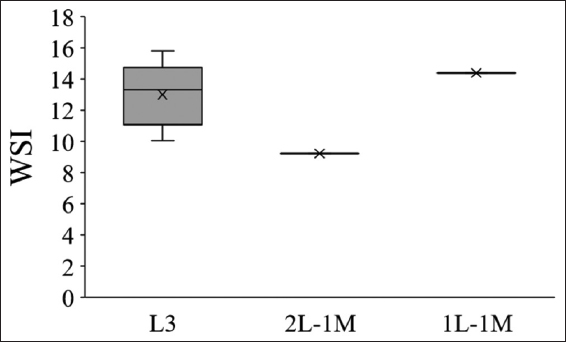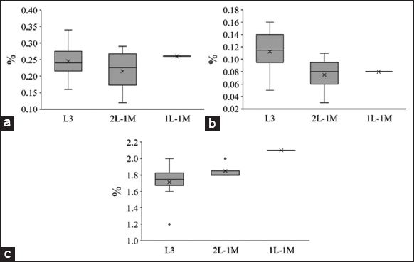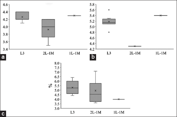 The study showed that the total soil soluble salt content of 3L or 2L-1M and 1L-1M had the average value of 0.038 ± 0.01%, 0.035 ± 0.01%, and 0.01 ± 0%, respectively. It was highly concentrated in the 3L and 2L cultivation areas [Figure 7b]. Therefore, the total dissolved salt content has not significantly affected the crop.
