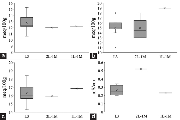 The SOM comprises plant and animal remains in various stages of decomposition, microbial cells, tissues, and substances that soil microbes produce [34]. According to Ha, if the soil is poor in OM, it accelerates leaching and soil erosion [4]. Applying composted materials to soils is expected to increase the quantity and quality of soil organic matter. The OM content in Vietnamese soil ranges from 0.5% to 7.5% and is mainly concentrated in the topsoil [4]. [Figure 4c] reports the OM content in the soil of 3L, 2L-1M, and 1L-1M, which resulted in 5.30 ± 0.81%, 4.95 ± 1.62%, and 4.00 ± 0%, respectively. A 5.1–8% OM content is relatively good for crop production [35]. According to Horneck et al., the CEC, total soil N content, and other soil properties, including water-holding capacity and microbial activity, are all increased with an increase in SOM [36].