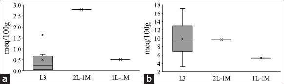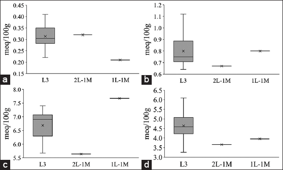 The concentration of Al3+ recorded in the cultivated land was low in the study area. Specifically, in 3L, 2L-1M, and 1L-1M crops, the mean exchanged Al3+ content was 0.51 ± 0.62 meq/100 g; 2.8 ± 0 meq/100 g and 0.52 ± 0 meq/100 g, respectively [Figure 9a]. Exchanged Al3+ is one of the causes of acidity. The more acidic the soil, the higher the mobile aluminum content and the more toxic it is to plants. Soils with pHKCl >5 often do not have soluble aluminum [46]. On the other hand, when pH <4.5, Al3+ has high solubility and will replace the bases in the exchange complex [44]. In the soil, aluminum can combine with Cl-, Br, I-, and SO42- to form easily hydrolyzed compounds and make the soil acidic. Besides, aluminum combines with phosphorus to create insoluble AlPO4 or Al2(OH)3PO4. That is one of the reasons for phosphorus being fixed in the soil [4].