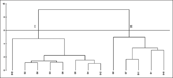 The CA results have formed two soil quality groups, in which I gathered the most locations, including D2, D3, D4, D5, D6, D8, D12, and D13. Group II included five sites, including D1, D7, D9, D10, and D11 [Figure 10].