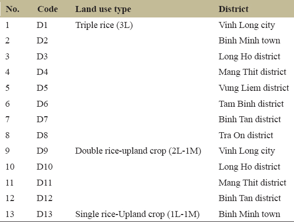 The rice land group has an area of 71,665.0 ha, accounting for 46.97% of the natural land area. Depending on the type of soil, hydrology, and water regime condition, rice cultivation includes five types of specialized cultivation models. 3L (three rice cropping seasons within a year, each rice cropping season is about 3 months), 2L (two rice cropping seasons within a year, each rice cropping season is about 3 months), 2L-1M (two rice cropping seasons continuously and one upland crop after second rice crop harvested, all cropping season within a year), 1L-1M (one rice crop and one upland crop after rice harvested, all cropping season within a year), and 1L-2M (one rice crop and two upland crop after rice harvested, all within a year) are distributed across districts, towns, and cities, including Vung Liem, Tam Binh, Mang Thich, Binh Tan, Tra On, Long Ho, Vinh Long, and Binh Minh. Triple rice, double rice-upland crop, and single rice-upland crop occupy a large area of 62,967.5 ha, accounting for 87.86%; 6.558.0 ha accounted for 9.15%, and 446.5 ha accounted for 0.62%, respectively [15]. Therefore, the three main cultivating models were selected for studying the physicochemical properties of soil [Figure 1].