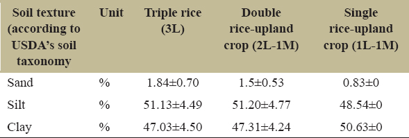 | Soil texture (according to USDA’s soil taxonomy | Unit | Triple rice (3L) | Double rice-upland crop (2L-1M) | Single rice-upland crop (1L-1M) |