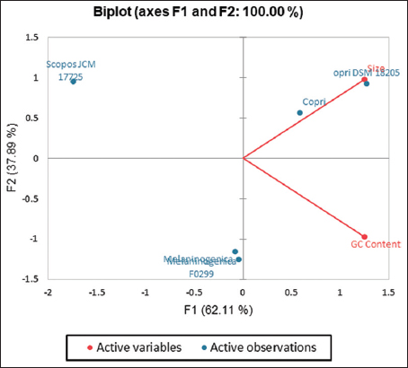 | Figure 2: A principal component analysis (PCA) biplot of variable size (MB) and GC (%) content for five plasmids of Prevotella (labelled in blue). Factor 1 and Factor 2 of the PCA show their percentage contribution in brackets. [Click here to view] |