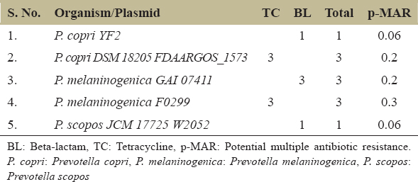 BL: Beta-lactam, TC: Tetracycline, p-MAR: Potential multiple antibiotic resistance. P. copri: Prevotella copri, P. melaninogenica: Prevotella melaninogenica, P. scopos: Prevotella scopos