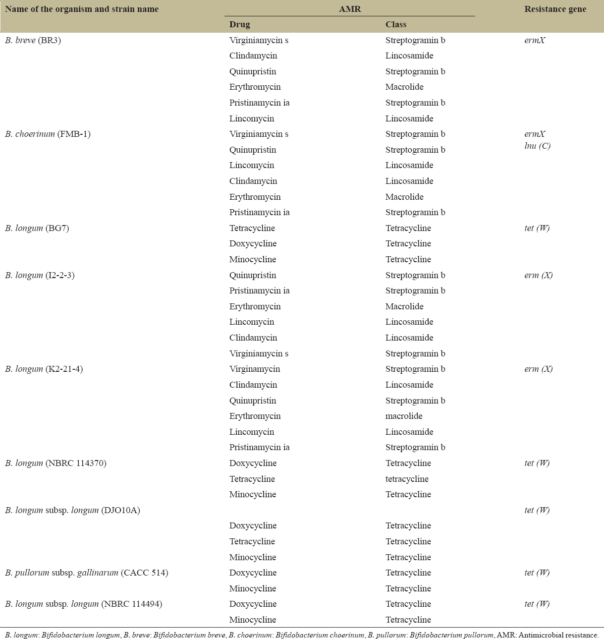 | B. longum (BG7) | Tetracycline | Tetracycline | tet (W) |