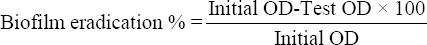 Where, Initial OD: OD of positive control; Test OD: OD of treated wells with antimicrobials.