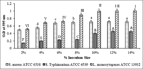 Different growth media such as LB, NB, and TSB have been assessed for potential biofilm formation using microtiter plate assay. Among them, at 10% inoculum size with TSB media, maximum biofilm formation was observed for indicator organisms S. aureus, and L. monocytogenes while in case of S. Typhimurium, maximum biofilm formation observed in same TSB media but at 12 % of inoculum size [Figure 2].