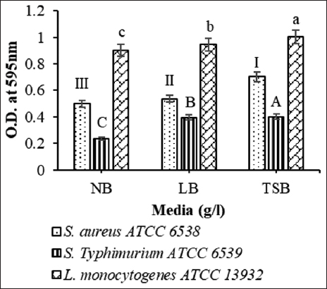 Test organisms S. aureus, L. monocytogenes, and S. Typhimurium were activated in a sterile TSB medium and incubated overnight at 37°C. Further, the cultures were centrifuged and cell pellets were dissolved in sterile distilled water. The cell density of pathogens was adjusted to 1 × 108 CFU/mL. In a sterile microtiter plate, 200 μL sterile NB, Luria Bertani broth (LB), and Tryptic Soybean casein Broth (TSB) medium were added in triplicates [34]. Media-containing wells were inoculated with 10% activated indicator cultures and plates were incubated for 24 h at 37°C. The next day, as described earlier staining procedure was carried out and cell density was measured at 595 nm using an ELISA reader.