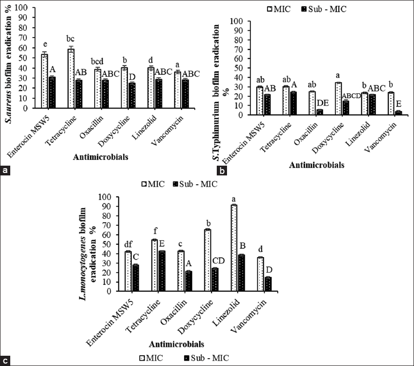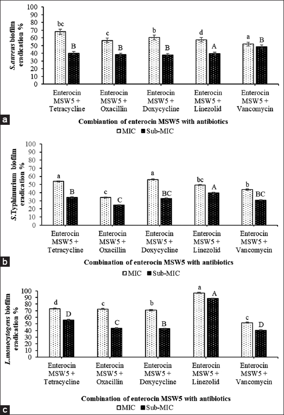 | Figure 3: Biofilm eradication of pathogens by antimicrobials (Enterocin MSW5 and antibiotics alone) at their minimum inhibitory concentration (MIC) and sub-MIC values. (a) Staphylococcus aureus biofilm eradication by antimicrobials (b) Salmonella Typhimurium biofilm eradication by antimicrobials (c) Listeria monocytogenes biofilm eradication by antimicrobials. Different letters above the bars denote statistically significant differences at P < 0.05 by Tukey’s test. [Click here to view] |