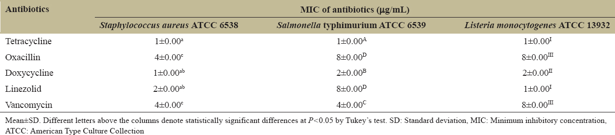 Mean±SD. Different letters above the columns denote statistically significant differences at P<0.05 by Tukey’s test. SD: Standard deviation, MIC: Minimum inhibitory concentration, ATCC: American Type Culture Collection